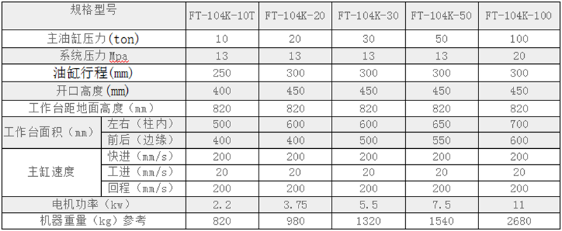 FT-106K-10T 20T 30T 50T 80T 100T四柱子母缸快速油壓機(jī)采用四柱三板框架式結(jié)構(gòu),先進(jìn)的子母缸液壓回路.無論是噪音,速度, 耗電功率,均優(yōu)于普通液壓沖床,是款高速度高出力的新一代液壓沖床,本機(jī)在壓鑄行業(yè)應(yīng)用廣泛。
